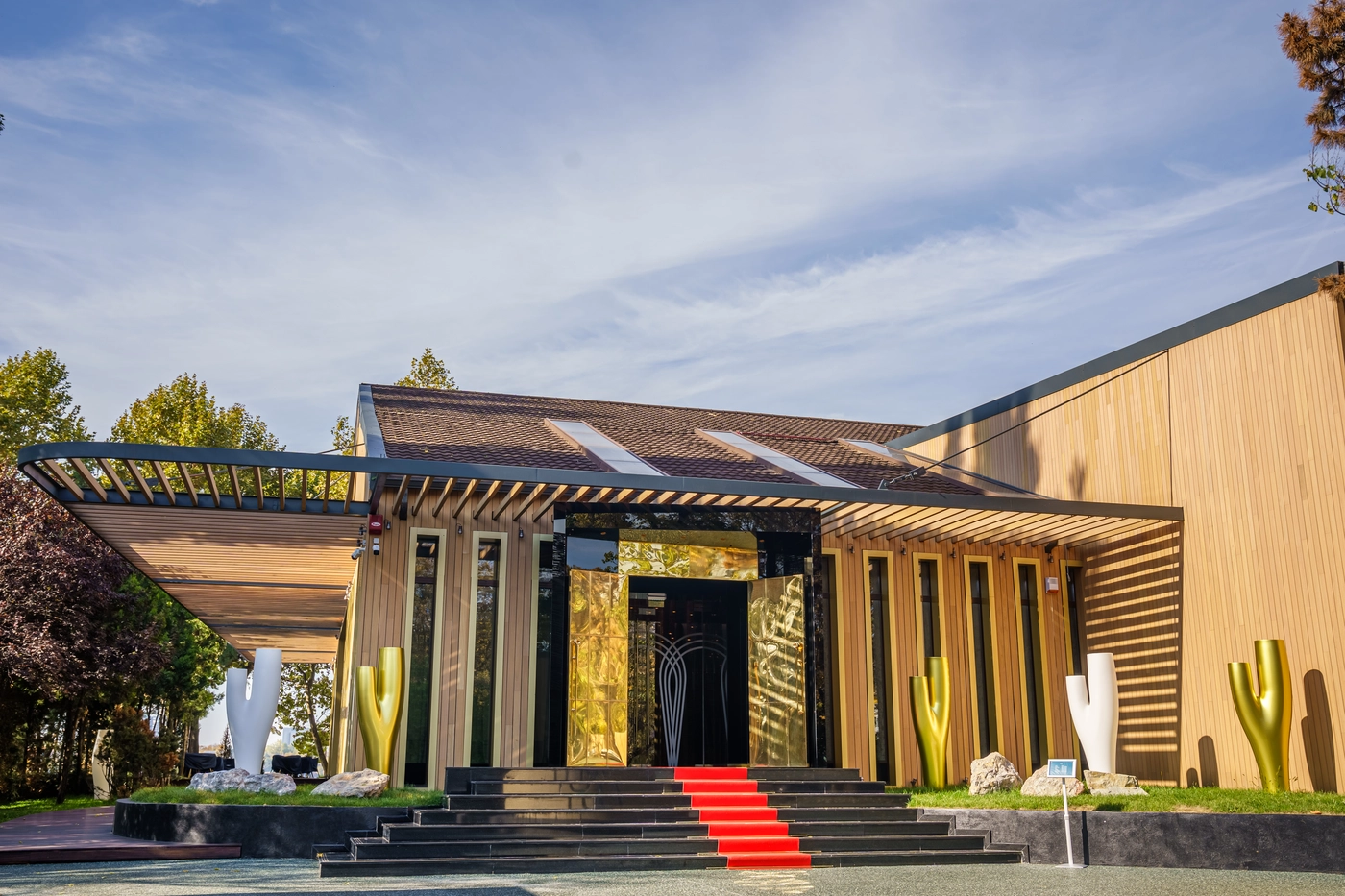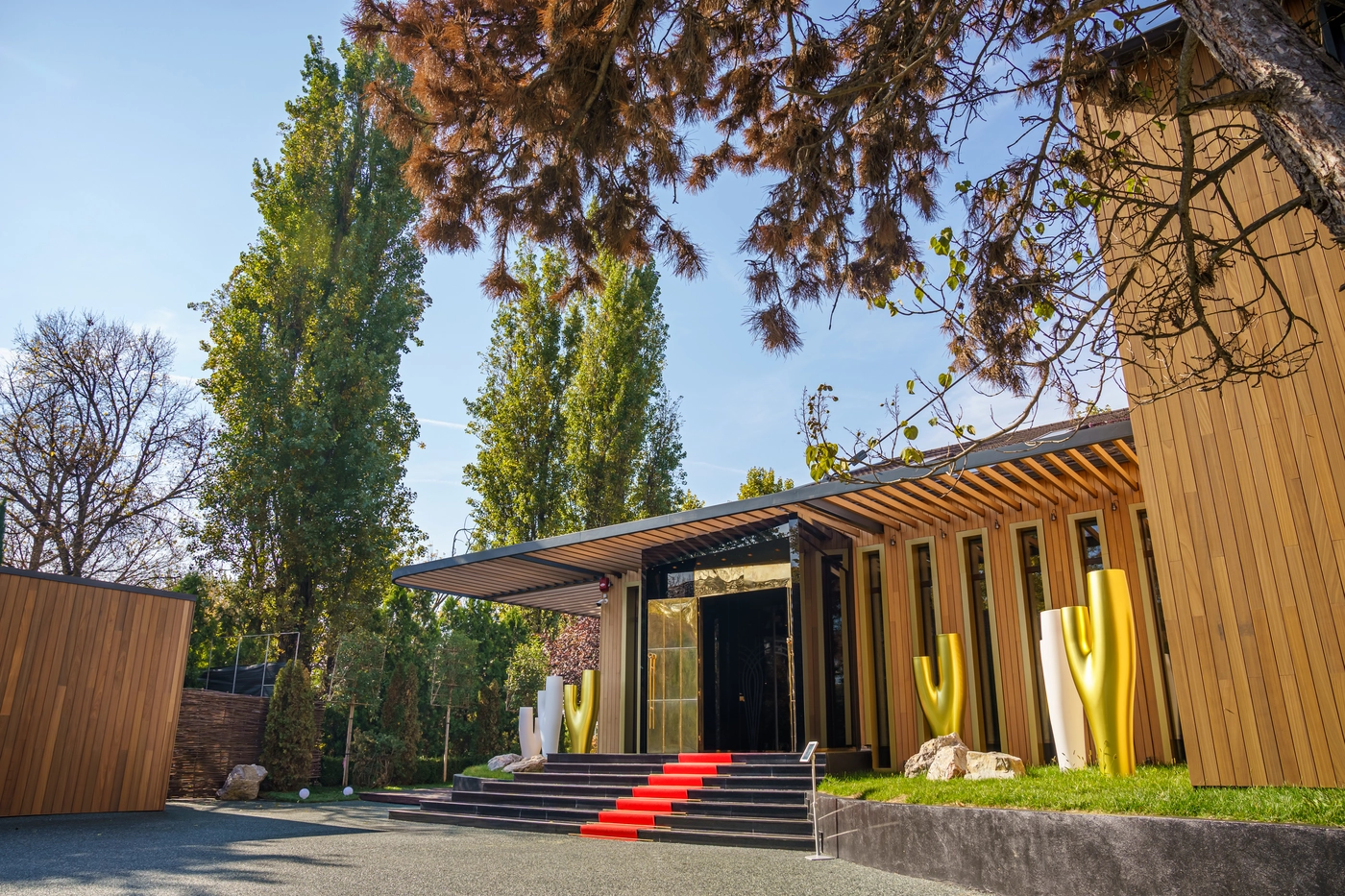 Für den Außenbereich wählten wir exotisches Holz, um eine natürliche und raffinierte Atmosphäre zu schaffen. Die Terrassen wurden mit dem Vetedy Softline-System aus Padauk-Holz verkleidet, während die Fassaden und Zäune mit dem Techniclic-System aus thermisch behandeltem Ayous-Holz versehen wurden. Darüber hinaus werden die Überdachungen von massiven Trägern getragen, alle aus demselben exotischen Holz gefertigt, was ein einheitliches und luxuriöses Erscheinungsbild verleiht.