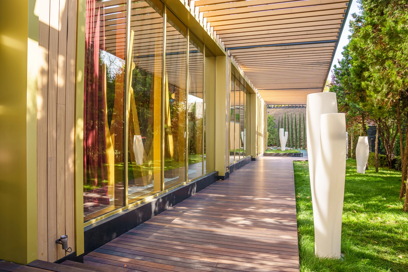 - Ästhetik: Die Holzlamellen bieten ein modernes und natürliches Design, und ihre Farbe entwickelt sich im Laufe der Zeit zu einem patinierten Aussehen.